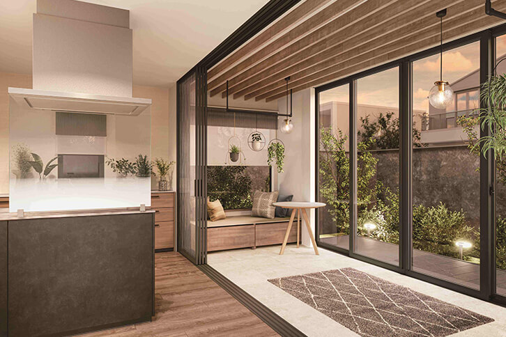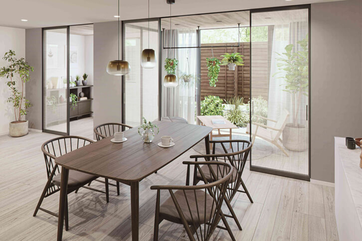 仕事がテレワーク中心になったのを機に、自然が豊かな郊外の中古住宅を購入しリモデル。最大のポイントはインナーテラスです。「仕切る」と「開放する」で、間取りを自在に変えられます。さらに窓を開ければ、庭とリビングキッチンがシームレスにつながり、自然を楽しめる大空間に早変わり。テレワークはもちろん、子どもたちのプレイスペースに、夫婦のくつろぎスペースに、そして自然たっぷりのアウトドアリビングに、ワクワクする「おうち時間」が生まれる家です。