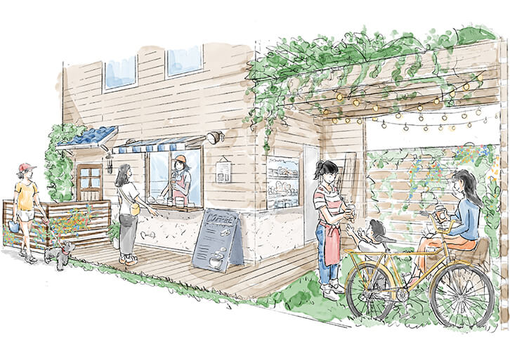 カフェ勤めの娘と一緒にパンが自慢のコーヒースタンドを開業。玄関先の庭を生かしつつ、玄関の隣にあった部屋をコーヒースタンドにリモデルしました。同時にリビングのパントリースペース、自宅玄関の目隠しなど、使いやすさとプライバシーを確保した間取りです。テイクアウトが中心ですが、スタンド脇にはベンチを設けてゆっくりコーヒーと手作りパンを楽しんでもらっています。みんなの美味しそうな笑顔を思い浮かべながら新作パンを考える毎日です。
