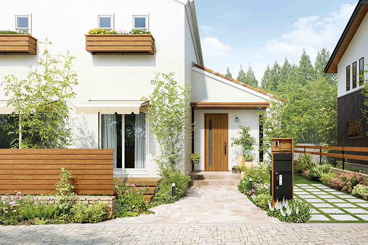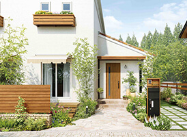 緑のある暮らしに憧れて購入した庭のある中古の一軒家。リモデルのポイントはもちろん外まわり。特に玄関まわりは住む人のセンスが見える“住まいの顔”。だからこそ自分らしいデザインにしたい。雨ざらしだった駐車スペースに設けたシンプルでスマートなカーポートをはじめ、門袖、玄関ドアを木調デザインでコーディネート。さらにアプローチの植栽にもこだわり、ナチュラルで落ち着いた印象で来訪する友人たちを迎えます。もう一つはリビングからそのまま出入りできる屋外の広々デッキ。庭の緑や心地よい風を楽しめる、家族はもちろん来訪者みんなのお気に入りの場所です。そしてデッキを降りた日当たりの良い庭には夢だったポタジェ(家庭菜園)。毎朝の食卓にとれたてトマトが並びます。
