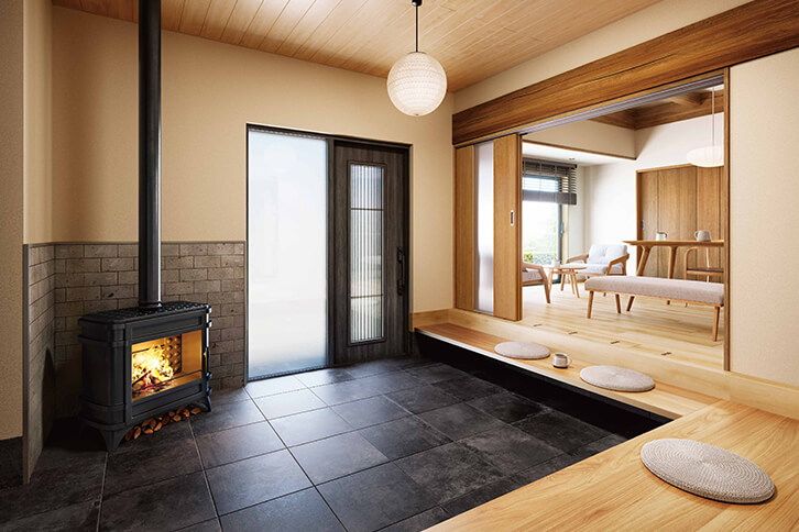 2人目の子どもが生まれたのをきっかけに、離れて暮らす両親と三世代一緒に暮らすことにしました。実家の趣は残しつつ、新しい生活に合わせて楽しく安心して暮らせる家にリモデルしました。部屋をつないで開放的になったLDKや、薪ストーブを囲む土間リビングなど、家中にだんらんスペースがあり家族の会話も弾みます。防災対策やバリアフリー、断熱性能も強化して将来の備えも万全です。
