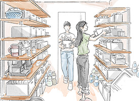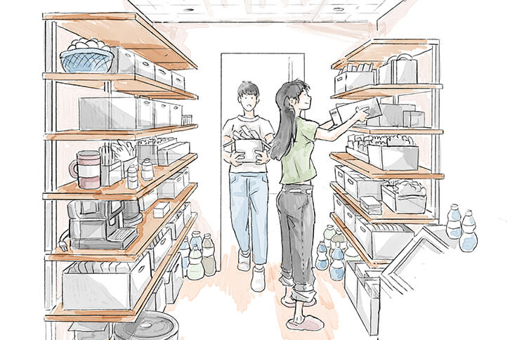 ウォークスルーのパントリーを設けることで、モノが多く片付けが大変だったキッチンまわりがスッキリ。さらにリビングを通らずにキッチンに出入りできる家事動線を設け、通路壁面を活用してパントリースペースにしました。頻繁に使わない食器や調理器具などはもちろんのこと、お米や箱買いのペットボトル、乾物やレトルトなどの保存食なども安い時にまとめ買いして収納。いざという時にも安心です。