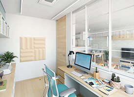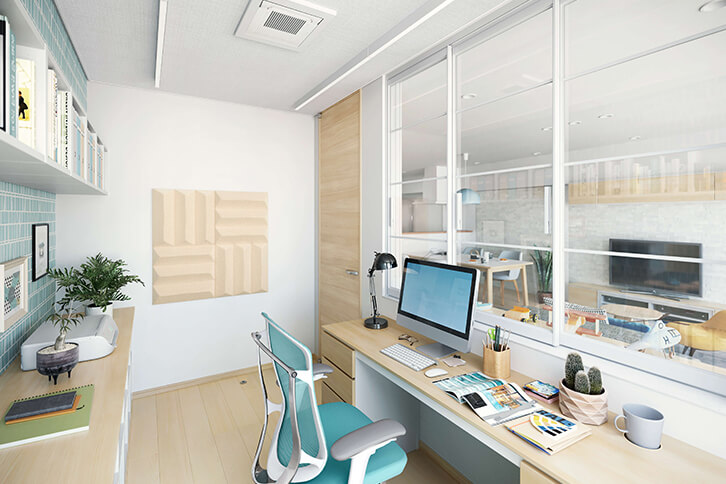 共働き夫婦と子ども1人の3人家族、仕事と家事の両立で忙しい毎日。仕事もテレワークが増え、マンションの購入をきっかけに環境を整えました。家でも仕事モードに切り替えられるように、ワークスペースを作りました。吸音性能の高い建材や、調光できる照明など、集中できる環境づくりにこだわっています。ガラス戸越しに子どもの様子を見守ることができ、安心して仕事ができます。