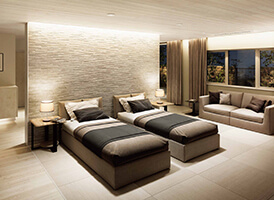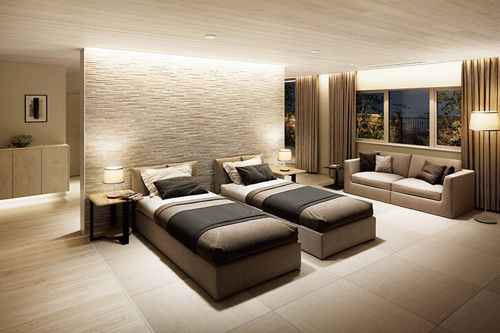 二世帯住宅へのリモデルは、旅好きの私たちが望んだホテルライクがポイント。中庭に面した私たちの部屋は、ベッドを中心としたくつろぎの空間です。新しくなった水まわりも隣接し、まるでリゾートホテルのスイートルームのような居心地の良さです。
