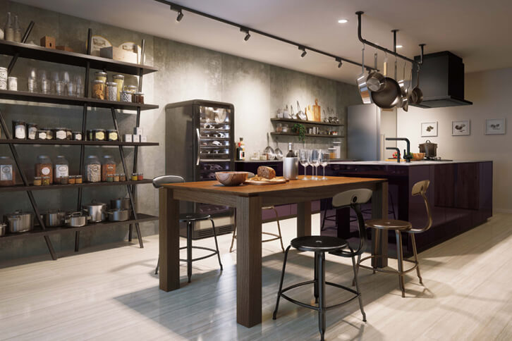 定年退職をきっかけに、子ども世帯の近くへ移住。一軒家からマンションへ、暮らしをコンパクトにしました。既存の扉や間仕切りをなくして広いLDKにリモデル。アイランドキッチンは、おしゃれなオープンキッチンのレストランのようです。最近は調理器具にもこだわり、キッチンが夫婦のコミュニケーションの中心になりました。