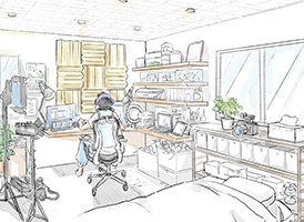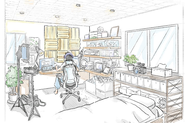 リフォームを検討していたところ、ミニチュアづくりが趣味の息子が自室をアトリエにしたいという。本格的に作品をつくり、それらをネットで発表するという息子の意見を取り入れ、使っていなかった2つの和室を大胆に繋げて息子の趣味部屋に。材料の収納スペースや作品の展示棚もつくりました。自然光が差し込む気持ちのいい作業スペースからは屋外のテラスに直接出られます。配信コンテンツ作りのための写真や動画撮影、音楽などを取り込むための編集スペースや機材も用意。もちろん、壁や扉、窓は遮音性能に配慮した仕様。テラスは息抜きだけでなく、撮影や塗装スポットとしても使っています。