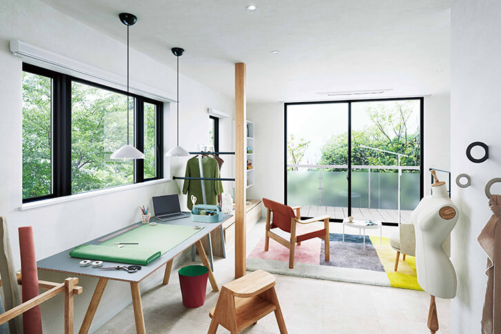 学生の頃から洋裁が好きで、いつかアトリエを持つことが夢でした。結婚し中古の戸建をリモデルすることになり、夢を実現するチャンスが訪れました。2階をワンルームに変えて、大きな窓から光が差し込む開放的な空間にしました。北の窓側は集中できる作業場にして、南のバルコニー側はくつろぎ空間に。最近は作品や制作風景をSNSに載せて楽しんでいます。